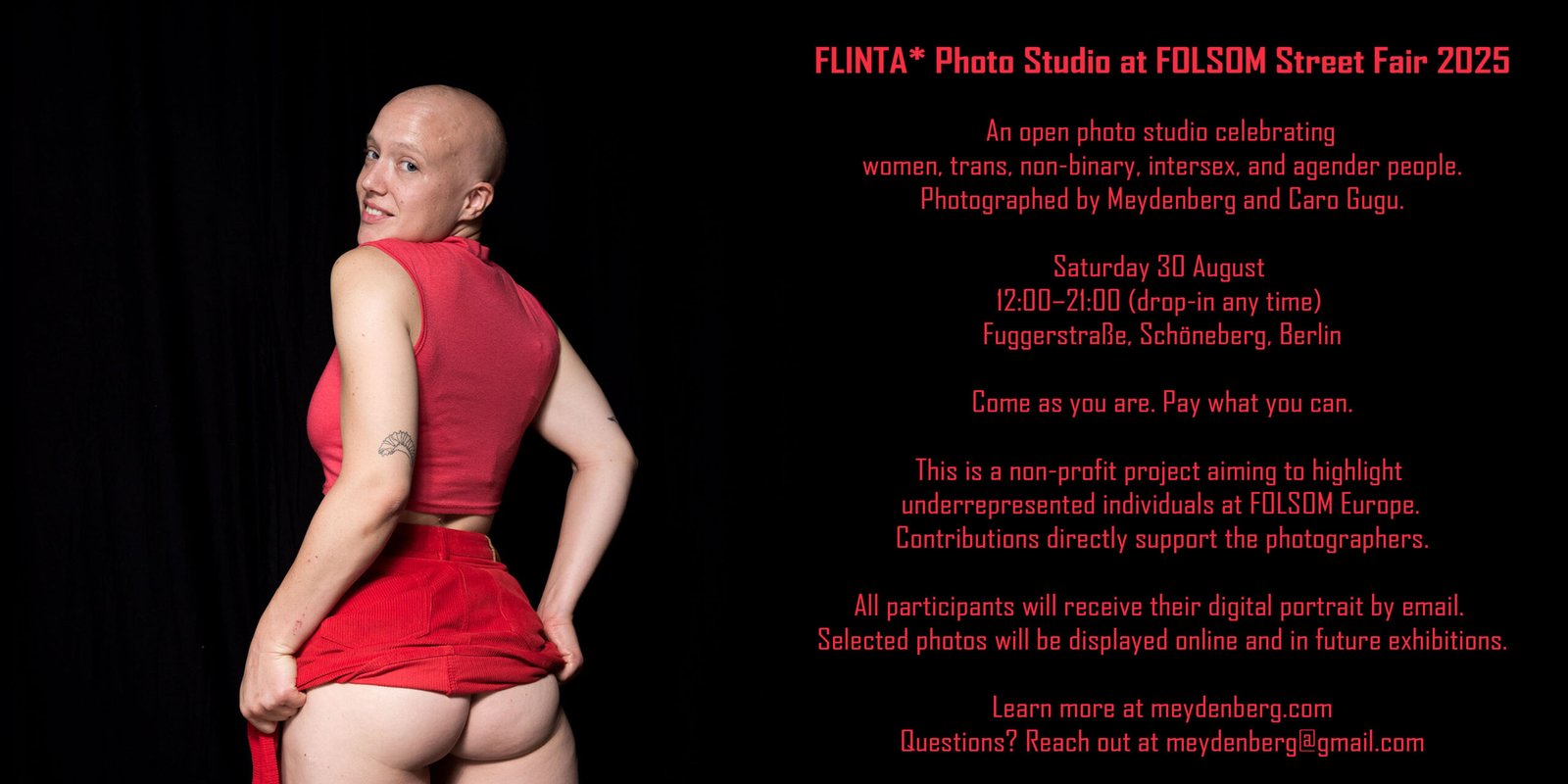 All participants will receive their digital portrait by email. Selected photos will be displayed online and in future exhibitions to promote diversity at FOLSOM Europe.